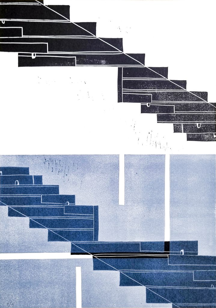 Die Grafik „Innen-Raum“ aus dem Jahr 2024, erschienen in einer kleinen Auflage von nur drei Exemplaren, ist ein eindrucksvolles Beispiel für Gisela Hachmann-Ruchs künstlerische Reduktionsstrategie. Ausgangspunkt war ein fotografischer Ausschnitt, der im Druckprozess zu einem abstrakten Raumgefüge aus horizontalen und vertikalen Elementen transformiert wurde.